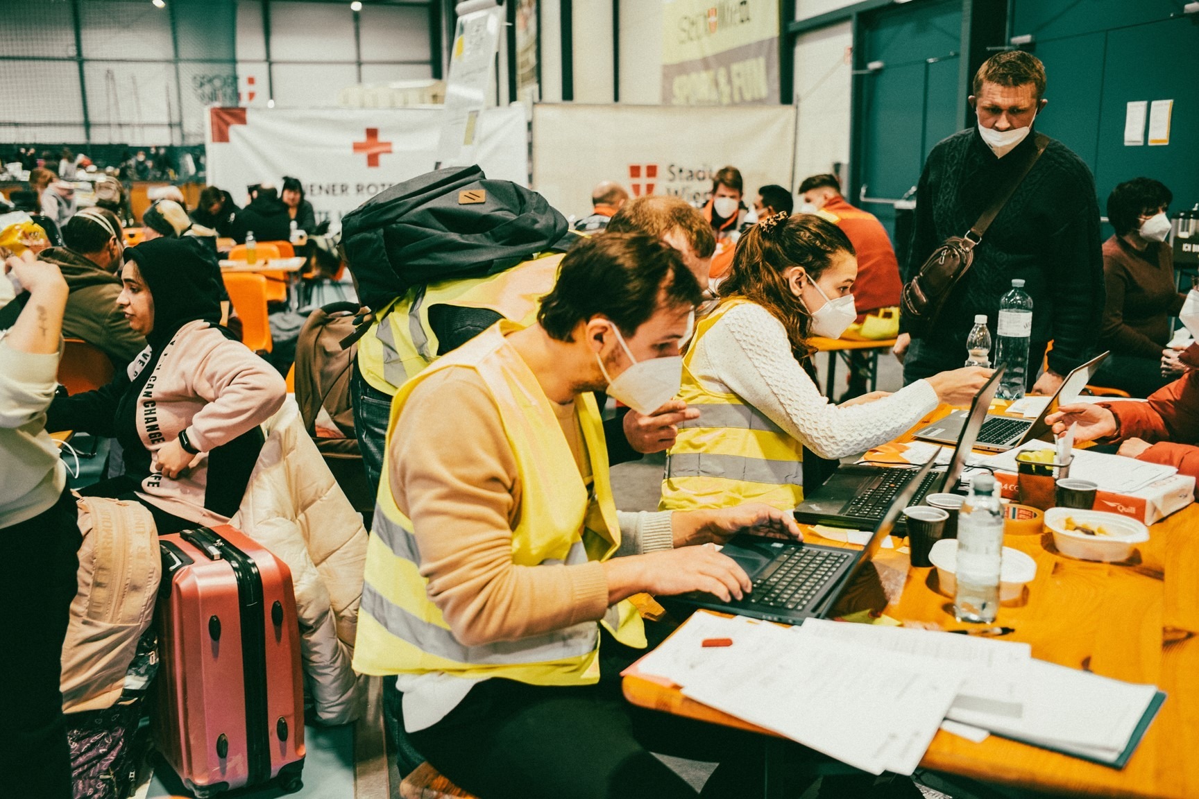 Wir sind das Team, das 2022 die Erstversorgung von über 135.000 Vertriebenen aus der Ukraine im Humanitären Ankunftszentrum Wien übernommen hat.